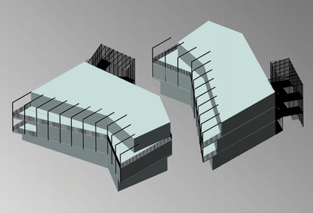 NEOBIČAN OBLIK PARCELE UTJECAO JE NA TLOCRTNI OBLIK - KUĆA JE „SAVINUTA“, KAO DA JE BILA UDARENA U SVOJE SREDIŠTE OD STRANE SUSJEDNE PARCELE. SLOJNICE TERENA PAK, „RAZREZALE“ SU JE I PO PRESJEKU, PO UZDUŽNOJ OSI. |