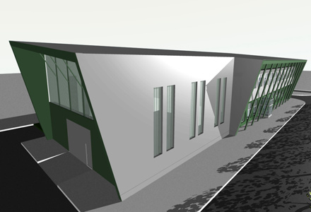 SKLADIŠTE, TRGOVINU I UREDE OBJEDINIO JE SREBRNI METALNI OŠTROKUTNI MONOVOLUMEN KOJI SE SAMO NA MJESTIMA KONTAKTA S VANJSKIM, OTVARA U ZELENOJ KORPORATIVNOJ BOJI. |
